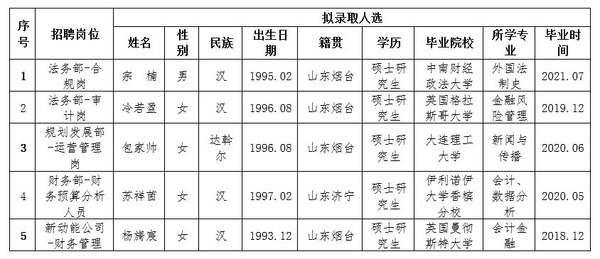 按照2020年8月28日發(fā)布的《2020年煙臺(tái)財(cái)金集團(tuán)面向“雙一流”和全球TOP200高校畢業(yè)生公開招聘簡章》相關(guān)規(guī)定,經(jīng)過簡歷收集、資格審查、初試、復(fù)試、集體決策等環(huán)節(jié),擬確定部分崗位錄取人選(詳見下表),現(xiàn)予以公示,公示期為5個(gè)工作日(9月29日至10月13日)。公示期間如有異議,請(qǐng)與煙臺(tái)市財(cái)金發(fā)展投資集團(tuán)有限公司聯(lián)系,電話:0535-6887256。