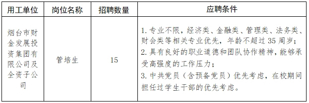 備注:市外首次來(lái)煙就業(yè)的35周歲以下(特別優(yōu)秀的年齡可適當(dāng)放寬)非應(yīng)屆畢業(yè)生,如有應(yīng)聘意向,可先通過(guò)管培生崗位應(yīng)聘,如符合煙臺(tái)市人才引進(jìn)政策,且順利通過(guò)集團(tuán)招聘考核,將根據(jù)應(yīng)聘人員工作履歷情況,結(jié)合集團(tuán)實(shí)際用工需求,主要分配到投資管理、融資租賃、保理、綜合文秘、運(yùn)營(yíng)管理等工作崗位。
